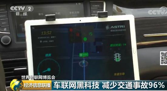 记者汤天奇:这辆车就是配有目前世界上最先进的车联网系统,我们在一个等红灯的十字路口,前方有大车看不到路灯还有多少秒可以通过,而屏幕上给出了一个提示——执行路灯剩余15秒、建议时速14公里、右方盲区车辆靠近…