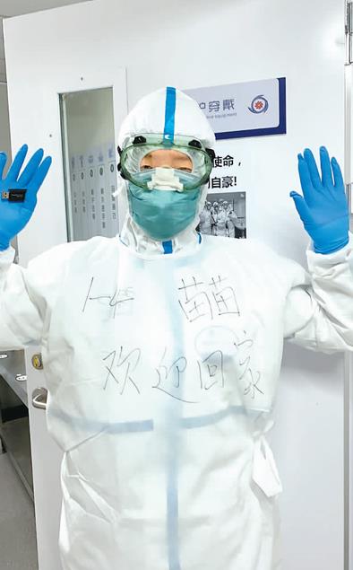 图为一名护理人员在防护服上写下“欢迎回家”的字样。 小汤山护理人员供图