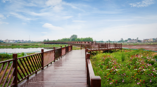 蓝天白云,微风徐徐,阳光下的稻虾公园格外惹人爱。走进稻虾公园,一节节栈道蜿蜒曲折,好似游龙;水边的格桑花郁郁葱葱,像争相跳舞的女孩;稻田清澈的水面波光粼粼,像碧绿的翡翠……游客陶醉其中,悠然自在,感受着现代农业产业园夏日的无限魅力。