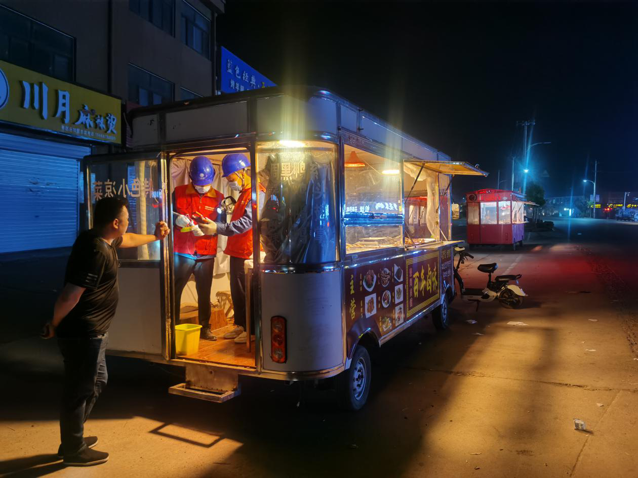 今年因为疫情的原因,李新的烧烤店闭店3个多月。复工复市闸门开启后,李新第一个在路边搭起了烧烤摊,小赵主动帮助李新把无烟烧烤炉具和配电设施搬了出来,装上热继保护开关和剩余电流动作保护器,又帮着安装配电箱、埋设电缆、拉上照明灯,用李新的话说,就是“每晚一键启动,剩下的就是等着客人来了”。