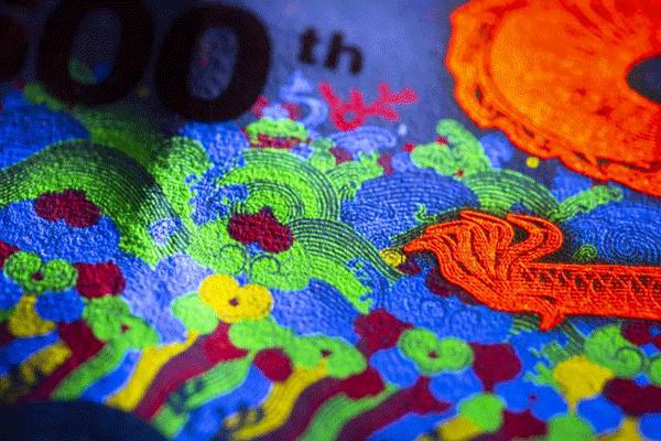 纪念券采用手工雕刻凹印技术,高清专用水印纸张,动感光变开窗安全线,红外对印、缩微文字、多种荧光套印、丝网光变、AR增强现实等十余种印钞造币独有的钞币设计与印制技术。尤其是双色凹印荧光油墨印刷,是该工艺在纪念券里的第一次应用;江崖海水纹采用胶印专色印刷,四种颜色线条水纹在日光下精准套印,在荧光灯下呈现四色炫彩效果。