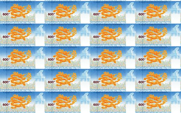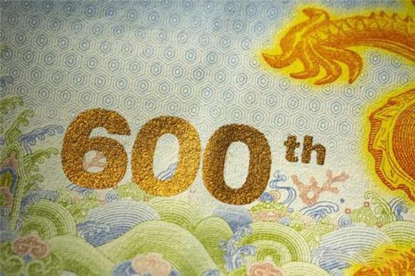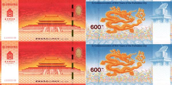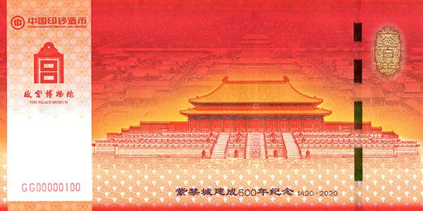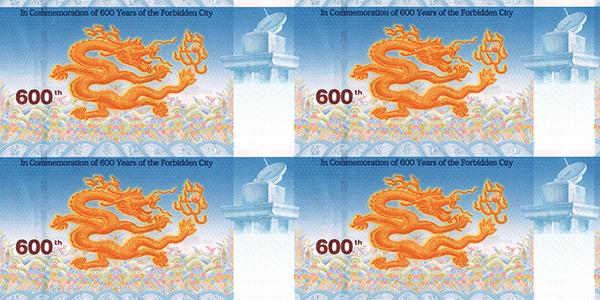 “紫禁城建成600年纪念券”是故宫博物院与中国印钞造币总公司签署战略协议后合作发行的首款产品。纪念券正面以太和殿为主景,背景辅以紫禁城鸟瞰图,同时展现其雄伟壮观与历史深邃。背面选用九龙壁上的第一条龙为主景图案。三交六椀菱花窗棂、琉璃砖雕、日晷、龟背纹、江崖海水纹等故宫经典元素分布在纪念券的不同位置。