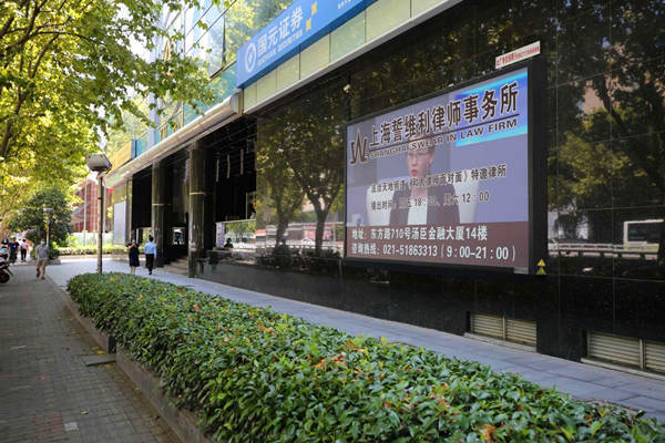 沿着东方路自南向北前往世纪大道地铁站,在路过汤臣金融大厦的大门之前,挂在大楼外立面的一幅大型广告牌格外引人注目,誓维利的名字赫然印在李维世主任参加《和大律师面对面》的节目照上。