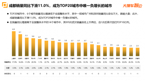 今年受疫情影响最大的武汉也迎来了汽车市场的全面复苏。报告显示,武汉地区9月汽车销量3.8万台,同比增长24.4%,增速高于全国整体水平,重回全国销量Top 10城市榜单。在销量Top 20城市中,一线城市广州和深圳销量同比变化不大,成都销量同比下滑11%,成为榜单中唯一负增长的城市,但总体销量仍保持在第3位。