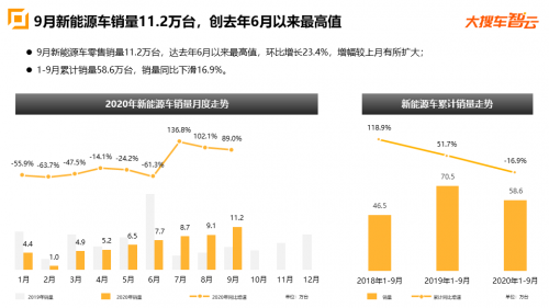 全国新能源车市场同样迎来了销量的大幅增长。9月,新能源车销量11.2万台,同比增长89%,环比增长23.4%,达到去年6月以来的最高值。1-9月新能源车累计销量58.6万台,同比下滑16.9%,相比1-8月累计销量同比26.9%的下滑幅度,全年整体销量大幅度收窄。