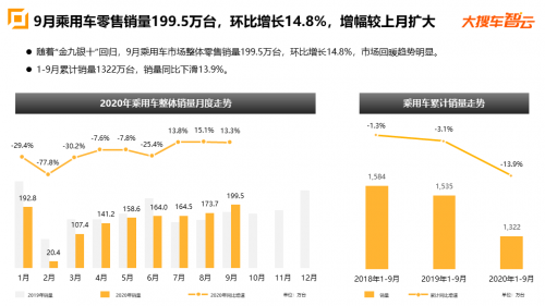 发布时间:2020-10-20 15:39:11 | 来源:消费日报网 | 作者: | 责任编辑:李媛近日,大搜车智云发布的《2020年9月乘用车零售量分析报告》显示,“金九银十”全国车市回暖趋势愈加明显,9月乘用车零售销量199.5万台,同比增长13.3%,环比增长14.8%。今年受疫情影响最大的武汉也迎来了汽车市场的全面复苏,重回乘用车全国销量Top 10城市。