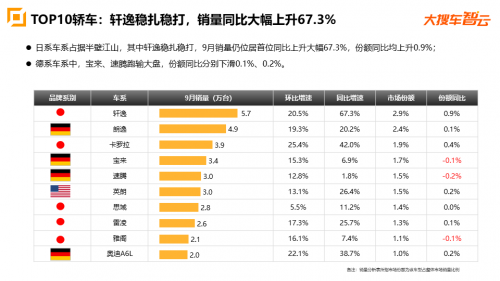 值得注意的是,在武汉地区9月销量TOP10中,朗逸为轿车销量最佳,轩逸销量不到朗逸销量的一半,而在全国市场,轩逸的表现则明显优于朗逸。其中,轩逸9月销量5.7万台,同比增长67.3%,环比增长20.5%;朗逸9月销量4.9万台,同比增长20.2%,环比增长19.3%。而轩逸为东风日产所生产的车型,10月份在武汉地区的销量或将受湖北补贴政策影响有更大幅度的增长。