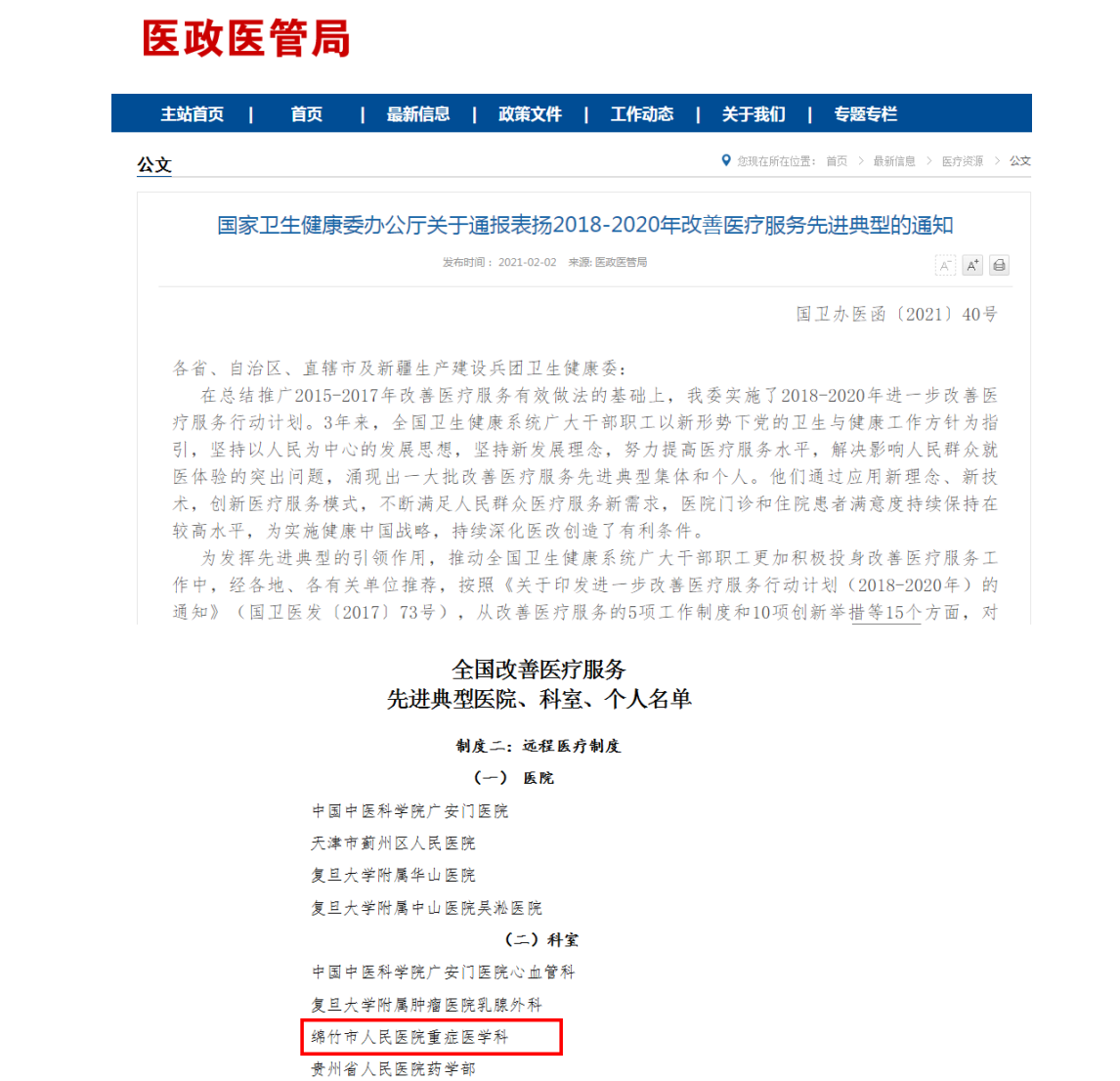 发布时间:2021-02-08 14:51:28 | 来源:中国网 | 作者:冯晓东 | 责任编辑:李星近日,国家卫生健康委办公厅发布《关于通报表扬2018-2020年改善医疗服务先进典型的通知》,绵竹市人民医院重症医学科作为改善医疗服务先进科室被通报表扬。