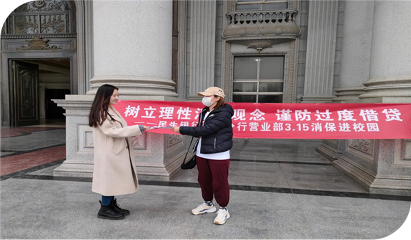 为了让学生更好地辨别金融消费中的良莠,提高自我防范意识,分行营业部的员工围绕着“树立理性消费观念,谨防过度借贷”这个主题,采用了线上线下相结合的宣传形式。