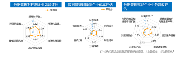 从数据管理对风险控制、降低成本、赋能业务营收三大方面评估总分看,风险控制成效为3.45排在第一位,赋能业务营收位3.15排在第二位,降低成本为3.10排在第三位。