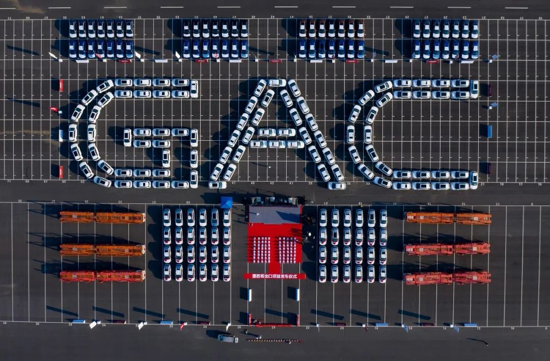 首批新车发车仪式上,数百辆新车组成“GAC”车阵