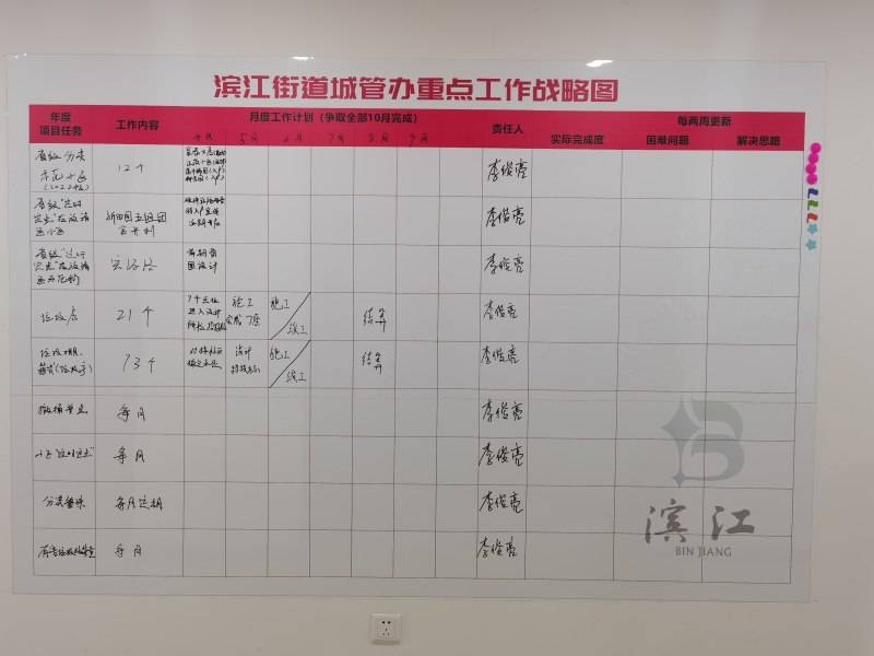 接下来,每个月初滨江街道城市管理中心都会通过召开工作例会的方式,全体干部一起盘点当月工作进展情况,互学互比,总结工作推进中遇到的困难,互相交流心得体会,为下一步工作寻求意见和思路。“根据图表用数据说话,能够有效地在总结讨论中,校准工作节奏、改善工作方式、提高工作效率。”揭榜挂帅、挂图作战,大大激发了城市管理中心干部们的潜力和信心,少了整天“就事论事、嘴上忙活、任务没动”的功夫,多了倒排时间、倒逼进度,把重点、难点、堵点逐个“击破”,推进工作步步向前的干劲。