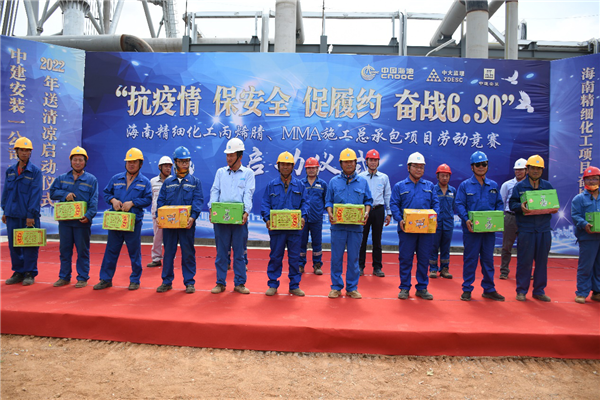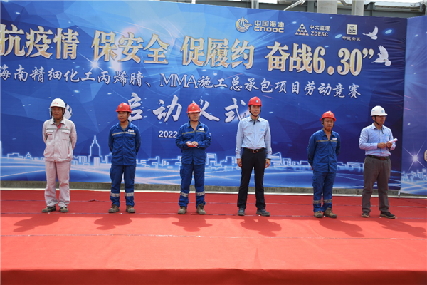 发布时间:2022-05-27 13:49:24 | 来源:中国网 | 作者:马黎 | 责任编辑:赵茜近日,中建安装海南精细化工项目二期工程丙烯腈、MMA装置安装工程施工总承包项目举办“抗疫情、保安全、促履约、奋战630”为主题的劳动竞赛活动暨三号联创、送清凉活动,标志着项目进入了最后的冲刺阶段。中海油富岛公司丙烯腈项目组总经理张田英、河南中大监理总监孙红文、中建安装一公司领导朱国锋、项目部及工人代表参加仪式,项目部生产经理任志城主持活动。