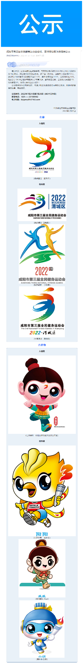 咸阳市第三届全民健身运动会会徽、吉祥物征集评选结果进入公示阶段。为确保评选活动公平、公正、透明,渭城区在官方网站、政务微信等平台发布《咸阳市第三届全民健身运动会会徽、吉祥物征集评选结果公示》信息,面向全社会对入选本次运动会的会徽、吉祥物作品进行公示。(中共咸阳市渭城区委宣传部)