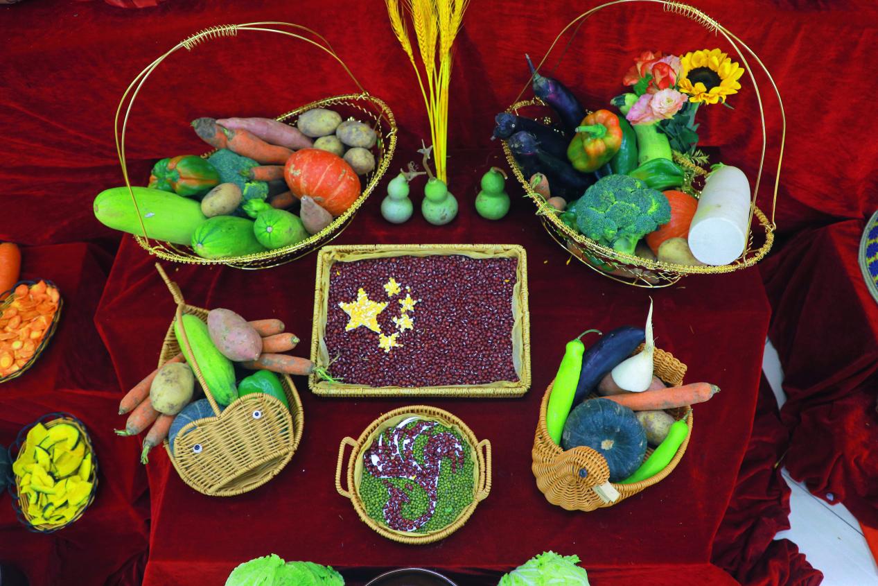 参加展示活动的师生们利用萝卜、白菜、玉米、胡萝卜等农作物,结合自身专业所学,运用非遗剪纸、雕刻、粘贴、编织等方式打造出来了独具创意的产品成果展。此外,现场还展示了九棵槐学生农耕园试种的巨型南瓜,其中最大的一个重61.5斤,展现了我国科技兴农和劳动教育硕果丰收的景象。