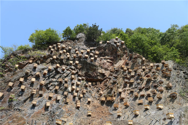 图为擂鼓镇广山村月亮湾石壁上养殖的中华小蜜蜂