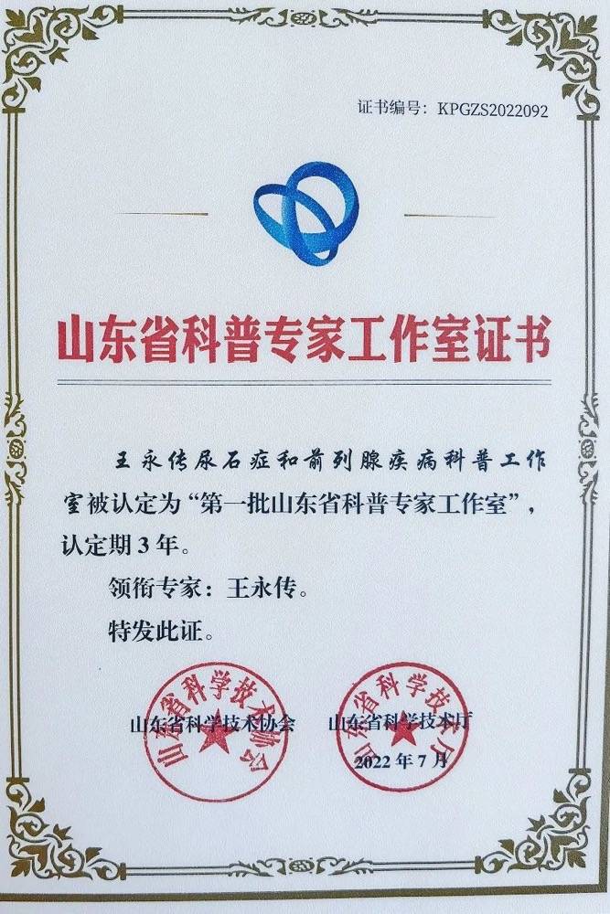 潍坊市中医院东院区泌尿外科主任王永传博士领衔的“尿石症和前列腺疾病科普工作专家团队”经山东省科学技术协会和山东省科技厅评审,成功入选第一批山东省科普专家工作室(鲁科协办发〔2022〕11号文件)。