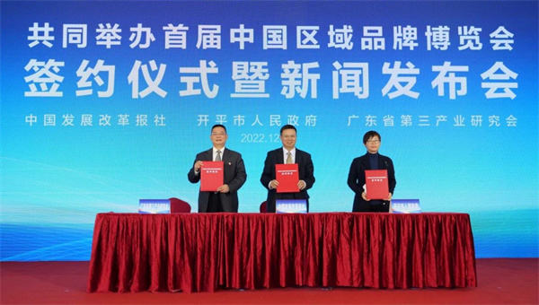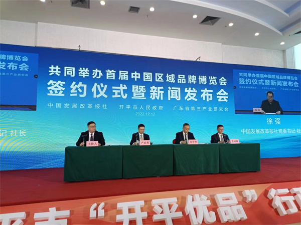 发布时间:2022-12-13 12:04:34 | 来源:中国网 | 作者:黎洛鹏 | 责任编辑:赵茜12月12日上午,中国发展改革报社、开平市人民政府和广东省第三产业研究会共同签署了关于举办第一届中国区域品牌博览会(以下称“博览会”)的框架协议,并举行专题新闻发布会,确定明年5月在江门开平市举办该博览会。据悉,博览会由中国发展改革报社主办、开平市人民政府承办、广东省第三产业研究会协办。这次博览会将积极邀请有代表性的区域品牌参加,通过举办区域品牌创新发展论坛、区域品牌及产品宣传推介推广、区域品牌产品直播带货等系列活动,为政府、企业和消费者搭建展示地方品牌特色、宣介区域品牌产品、提升品牌消费体验的重要平台。