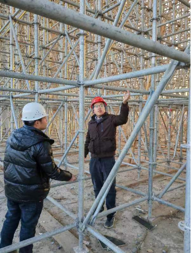 2月11日,新建集宁经大同至原平铁路山西段工程1标段跨滑雪大道现浇梁施工现场,山西铁建项目管理咨询有限公司一名监理工程师正在对现场满堂支架进行安全巡视检查。(白云飞)