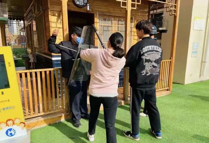 演练期间,按照既定模拟情景,一名“歹徒”在园外捡到一张接送卡,谎称是孩子家长接孩子回家,要求安保人员开门。安保人员与班主任联系后,发现男子所述与事实不符,未让其进园。“歹徒”趁安保人员不备闯入幼儿园,随即幼儿园启动“反恐防暴”应急预案。安保人员迅速按响一键报警器,向园长报告,同时拿起防暴工具试图控制“歹徒”。听到警报后,幼儿园老师立即停止手头工作,组织幼儿迅速就近向安全地带转移,防止“歹徒”对幼儿造成伤害。与此同时,安保人员手持盾牌、钢叉等防暴工具与“歹徒”周旋,最后成功将“歹徒”控制。
