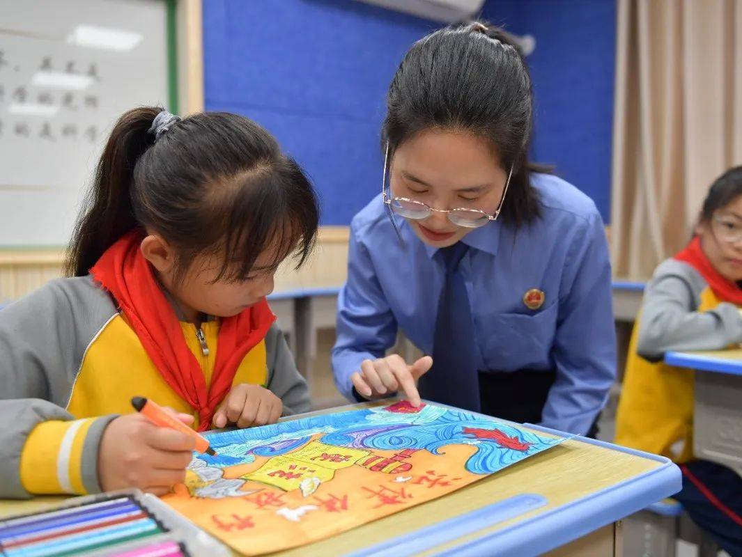 一支小小画笔,画出你心中的“法”。宣讲结束后,检察干警和孩子们共同绘制法治手抄报。一张张五彩斑斓的手抄报展现着孩子们对法治社会的期许和美好生活的向往。
