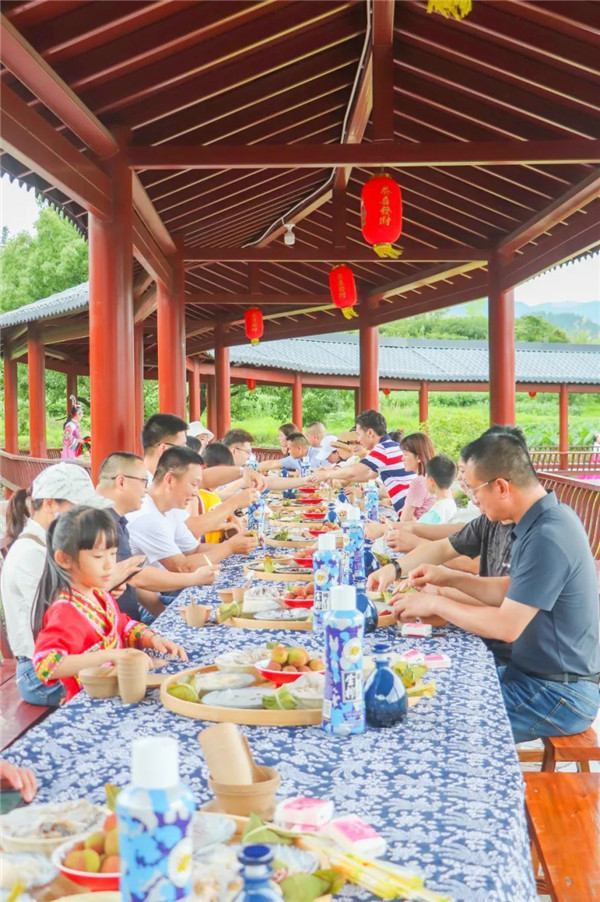 畲族长桌宴是畲族特有的饮食文化,数十米长的桌子上铺着民族风的蓝印花布,一道道畲族特色美食被放在竹制的圆框中,格外的精致。游客与畲族村民并排而坐,一边欣赏自然美景一边品尝畲族美味。