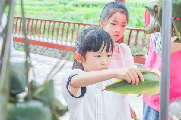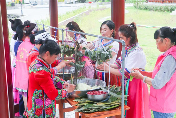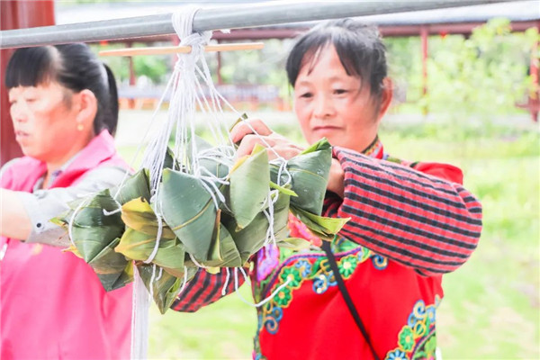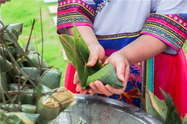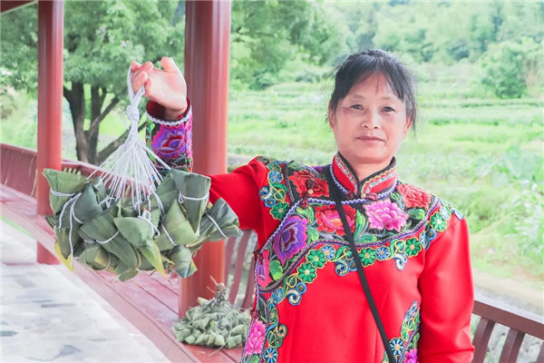 每逢端午,东阳的畲族村民就会身看民族盛装,相约在长廊包粽子,她们将粽叶卷成派斗状,添入糯米和馅料,再用草绳捆扎定型。期间,不少游客加入其中,体验包粽子的乐趣,在大家的努力下,一个个精巧的粽子便呈现在人们眼前。香糯的端午粽,蕴含着东阳畲族的民俗风情和畲民的热情与真诚,在包粽子的过程中,增进了各民族同胞之间的感情,也增强了民族团结的凝聚力。