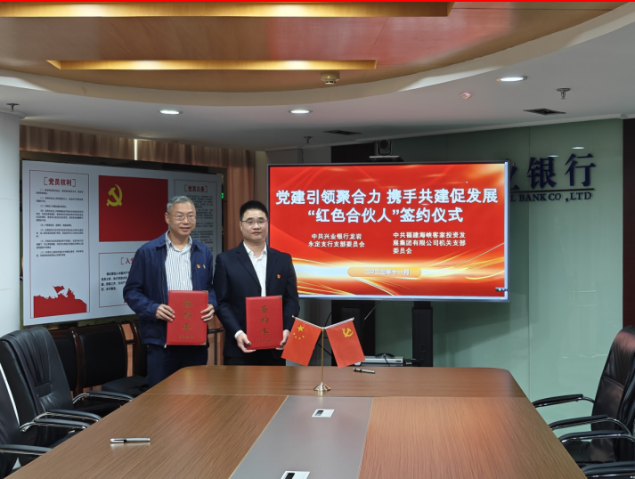 发布时间:2023-12-08 17:01:54 | 来源:中国网 | 作者:辛文 | 责任编辑:郭顶为全面落实党的二十大精神,以党建共建为平台,充分发挥党建引领作用,近日,中共兴业银行龙岩永定支行党支部与中共福建海峡客家投资发展集团有限公司机关支部委员会签订了“红色合伙人”党建共建协议书,共同打造银企合作共建新局面。