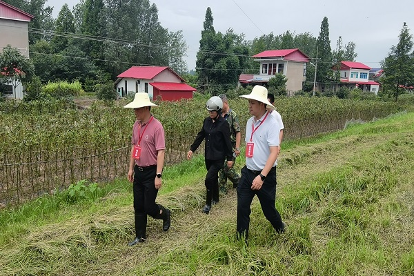 南县县委常委、政法委书记龚京榜(左一),南县人民政府党组成员、副县长刘靖(右一)深入防汛救灾第一线巡堤查险。