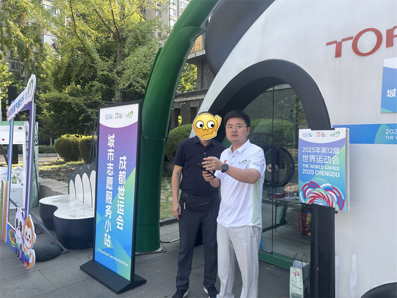 这个小站离最近的户外比赛场地仅有500米,10点刚过,拿着赛事门票和地图的外地游客就络绎不绝,带着不同口音的咨询声此起彼伏:“请问去桂溪公园赛场怎么走?”“世运会官方零售店在哪里?”“铁像寺离这儿有多远,从哪里可以过去?”队员们一边擦着额头刚冒出来的汗,一边耐心解答,遇到分不清方向的游客,还会手绘简易路线图,反复叮嘱“直走100米看到桥右转,这边路阴凉多一些,您可以走这边”。下午13点到15点是一天里最热的时候,四十多度的高温化作“蒸笼”,地面温度直逼50℃,队员们额头上的汗顺着脸颊往下淌,白色的志愿服隐约可见一圈圈白色的盐渍。即便如此,他们没忘了给户外工作者递份清凉——看到环卫工人路过、快递员抱着包裹小跑,都会主动招手:“快进来歇哈嘛,喝瓶藿香正气液防中暑!”
