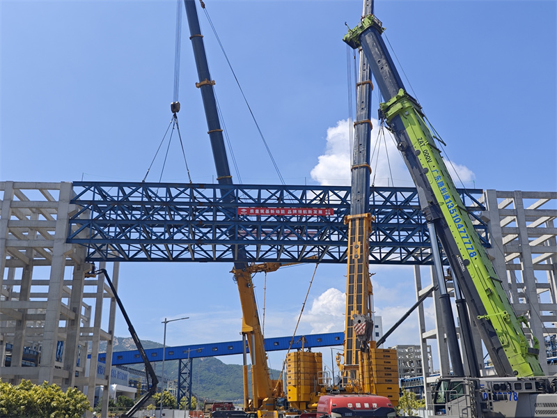 此次吊装的桁架重量达120吨,横跨疏港大道中央,属于超危大工程,吊装作业难度高。因桁架拼装位置与安装点距离较远、作业半径大,项目团队制定了专项吊装方案:首先采用1000吨与900吨吊车双机抬吊,将桁架同步起吊并平移至预定位置;随后由1000吨与750吨吊车配合完成最终就位作业。面对施工期间的道路封闭、交通组织等复杂问题,项目部积极协调相关部门,精心策划、多措并举,通过优化施工流程、强化现场管控,有效克服各项困难,保障了桁架安全、高效转运与精准安装,为E27钢结构主体施工画上圆满句号。