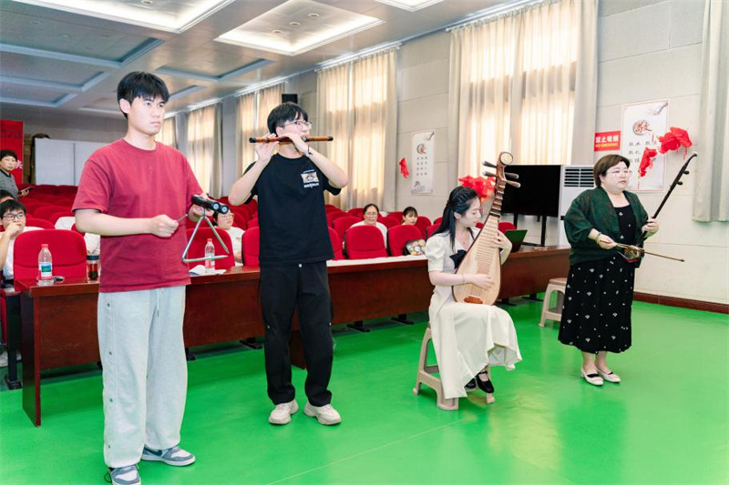 培训现场,团队从专业乐理知识切入,将重点放在《我的祖国》的和弦处理与声部变化上。针对扬琴、二胡等常用民族乐器,辅导老师现场示范演奏技巧:“扬琴在演奏‘一条大河波浪宽’前奏时,要把握好和弦的层次感,高音区轻弹营造水波荡漾的意境,低音区重音落点要与乐队节奏精准契合,避免出现音色断层。”文化中心的演员们一边认真记录和弦转换要点,一边分组进行器乐与声乐的配合练习。当调整后的《我的祖国》旋律在排练厅响起,扬琴的清脆、二胡的悠扬与合唱声部的温暖完美融合,现场掌声不断。参与培训的文化中心演员李大姐拿着记满和弦标记的乐谱感慨:“以前总觉得跟着旋律演就行,今天才知道声部配合里有这么多学问!老师教的扬琴和弦技巧、声部呼应方法特别实用,以后咱们排练节目,一定能让乡亲们听到更专业的演奏!”