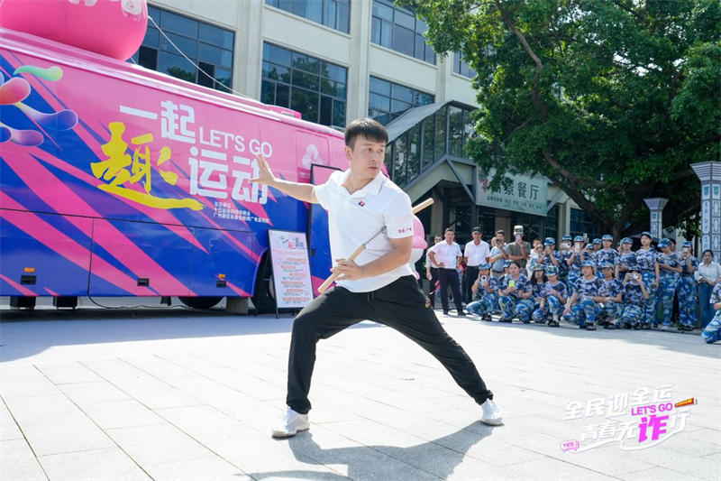 活动现场,全运主题巴士以“趣运动”为核心设计,十五运会吉祥物“喜洋洋”“乐融融”元素醒目呈现,提前营造“全民迎全运”的热烈氛围。作为五连冠双节棍世界冠军、吉尼斯世界纪录保持者、广州国际体育嘉年华传播大使,吕一杰的全运主题双节棍表演率先点燃全场——他凭借专业功底展现高水准双节棍技巧,棍影如风、动作酷飒,高难度招式配合节奏层层递进,每一次旋转与出击都引发师生欢呼,瞬间将现场氛围推至高峰。表演既贴合“全民迎全运”的活动主题,进一步浓厚校园运动氛围,更以极具观赏性的趣味形式吸引师生关注,为后续反诈宣传聚集人气,实现运动热情与反诈科普的自然衔接。