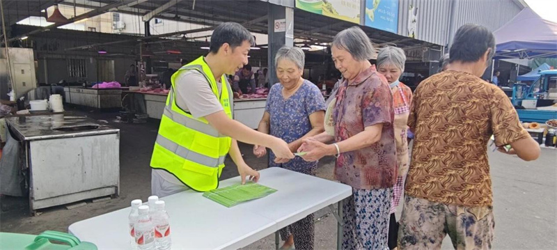 活动中,工作人员发放宣传手册并赠送矿泉水,为高温天群众送清凉;最后针对商户与摊贩高频易腐垃圾,上门手把手讲解分类要点,解决“分类难”问题。