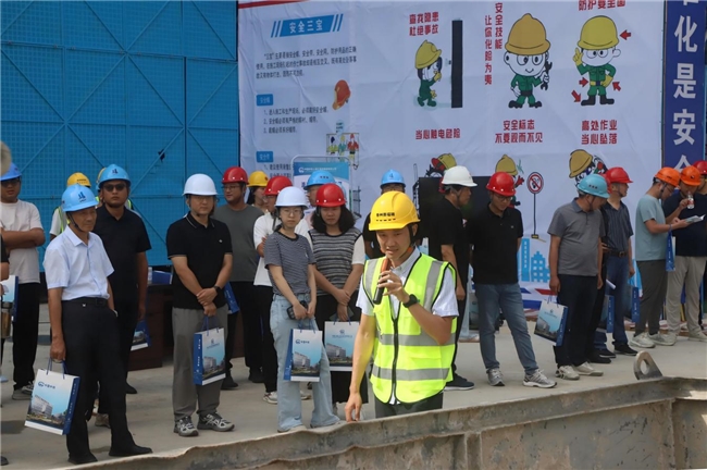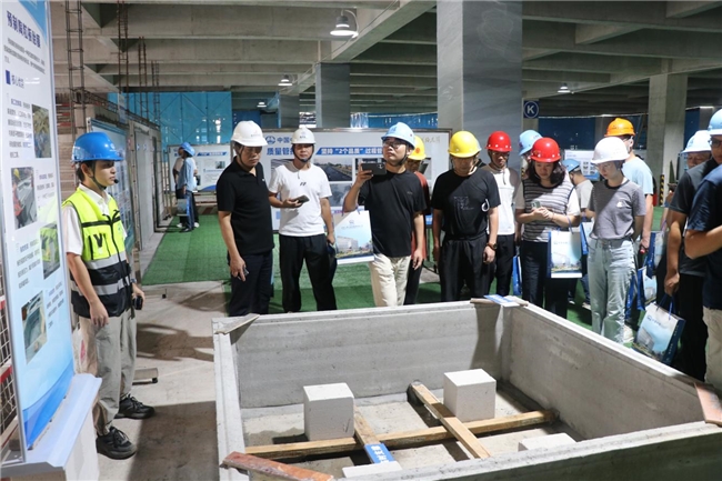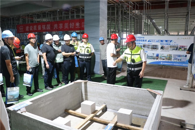 观摩期间,与会代表深入施工现场,全面了解了项目样板引路机制与质量管控核心流程,重点考察了项目在安全管理体系建设、人员培训、设备管控等方面的创新实践。在主体结构、砌体施工、风水电安装、流态固化土处理、预制板砖胎膜工艺等多个展示区,项目讲解员通过系统讲解与实例展示,清晰呈现了施工现场质量管理全流程与关键控制点。安全体验区与特种设备管理区通过实景演示与资料展示,全方位展现了项目“安全与质量并重”的管理理念。