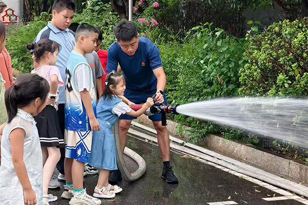 随后,孩子们兴奋地坐上消防车,感受“移动的消防站”。“哇,这个座椅好结实!”一位小男孩一边摸着座椅一边感叹。在试穿消防战斗服环节,孩子们全副武装,虽然行动略显笨拙,但脸上写满了自豪。“原来消防员叔叔出警时要穿这么重的衣服啊!”在操场,消防员演示了水带连接与水枪操作,还手把手教大家如何正确使用。“我要把水枪对准‘火苗’!”小朋友们认真瞄准目标,随着“呲”的一声,水柱精准喷出。