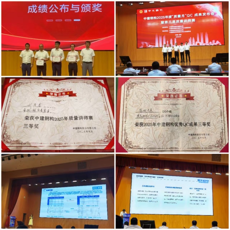 以赛促学、以赛提能,是本次质量月的鲜明特色。9月5日,公司先行开展内部QC成果发布与质量讲师赛选拔,优中选优推送参赛——最终,刘奕春在中建钢构2025年质量讲师赛中斩获三等奖,李志军在“质量月”QC成果发布中再添三等奖,胡艳、王大元等青年员工同步成长,为专业团队注入新活力。