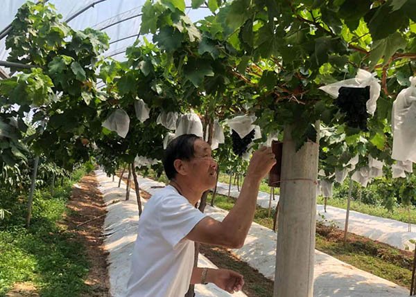 昆明兰露梦农业科技有限公司董事长张宝龙在基地里查看葡萄长势。
