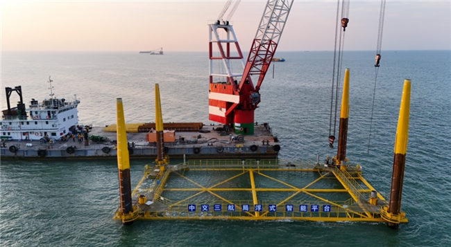 项目位于平均水深1至4米的浅海区域,近海作业潮位低,适配船机与专用机具稀缺,施工要求高、技术难度大。项目团队创新研发适用于浅海区的稳桩平台,总结出“海上光伏浮式稳桩平台钢管桩沉桩施工技术”。技术攻关小组基于20万组水文数据分析,配套研发“智能无人定位系统”和“成套钢管桩标高测量方法”,一次定位后可以施工4根桩,桩基垂直度偏差控制在0.3%以内,突破行业标准,避免了传统打桩船频繁移船作业对底栖生物栖息地的反复破坏。