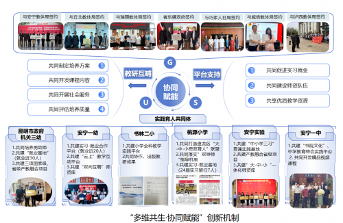 打破“围墙思维”,构建“高校主导—政府统筹—中小学协同”育人共同体:20%的教师教育课程由高校与中小学联合授课,实现理论教学与实践需求无缝对接。学校与安宁市教体局、威信教体局、巧家县人社局等7个政府部门签署战略合作协议,形成高校主导、政府部门融通资源、中小学幼儿园协同教学。共同:“制定培养方案、开发课程内容、建设教学资源、建设师资队伍、促进实习就业、开展社会服务、评估培养质量”实现高校“单向输血”到校-政-企联合“系统造血”的转型。