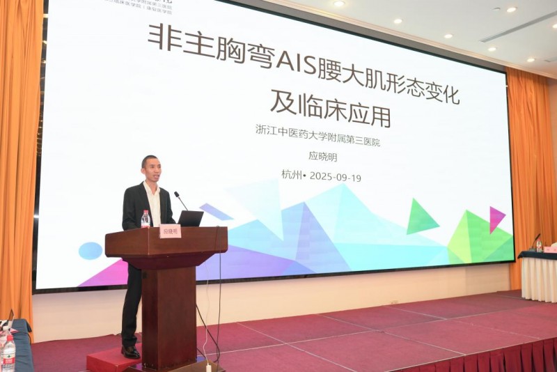 紧随其后,承办方浙江省针灸学会脊柱侧弯专业委员会主席、浙江中医药大学附属第三医院推拿科副主任中医师应晓明,聚焦临床痛点展开《非主胸弯 AIS腰大肌形态变化及临床应用》主题演讲。他结合临床诊疗数据与解剖学研究,深入剖析非主胸弯型青少年特发性脊柱侧弯(AIS)患者腰大肌形态的特征性变化,及其在病情评估、个性化治疗方案制定中的临床价值,为中西医结合优化脊柱侧弯保守治疗路径提供了扎实的本土临床依据,彰显产学研融合背景下中国脊柱健康研究的精准化与本土化实力。