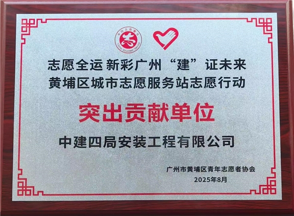 仪式上,团黄埔区委副书记向中建四局安装工程有限公司颁发感谢牌匾,高度肯定企业“以匠心筑善举、以行动践初心”的公益精神:“中建四局安装工程有限公司不仅为志愿服务站提供物资保障,更以专业力量完善驿站功能,让‘志愿全运’理念扎根基层,让志愿精神与全运精神交相辉映。”