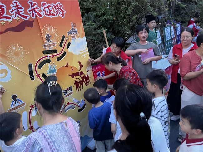 17:30,游园活动准时开启,五大特色关卡在明朗社工与党员志愿者的引导下有序运转,居民手持“银票”沉浸式参与。“遇见宋词之苏东坡喊你接龙了”关卡前,身着红色官服的“苏东坡”吟诵《水调歌头・明月几时有》,居民或接诵中秋诗词,或与“古人”对句,一句“千里共婵娟”引发全场齐声附和,传统文化韵味在互动中流转;“垃圾分类宋韵投壶”将宋代“四色汴京分类法”与现代环保理念结合,明朗社工提前在箭矢上贴好“废旧灯管”“剩菜剩饭”等垃圾名称,居民需精准投入对应颜色“投壶桶”,在趣味挑战中掌握分类知识;最受瞩目的“重走长征路”关卡,由党员志愿者扮演“红军”引导,青少年们沿着模拟长征路线前进,在4-8分钟的计时挑战中回顾革命历程,红色基因在游戏中悄然扎根;“欢乐钓月饼”“圈住好运套圈小兔子”则充满童趣,大人小孩齐上阵,党员志愿者与明朗社工及时补充道具、兑换奖品,现场笑声与掌声此起彼伏。