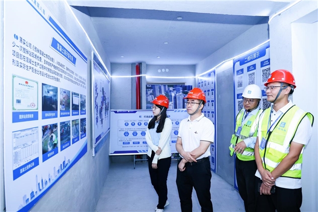 本次观摩设置四大展区,包括管理制度展示区、土建工序样板区、精装工序样板区与地下室样板区,系统呈现项目在质量管理、工艺创新与智慧建造等方面的实践成果。在管理制度展示区,展板详尽解读了中建八局的质量管理体系,内容涵盖施工管理基础能力建设与提升、领眸智慧工地平台应用、质量通病防控、安全管理机制及精细化设计等多个方面,全面展现企业推动精益建造与智能建造深度融合的先进理念。