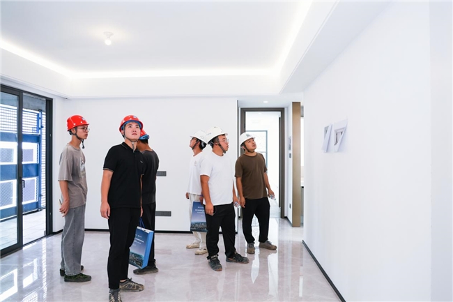 土建工序样板区集中展示了高精度砖砌筑与ALC墙板施工工艺。墙面平整度高、灰缝均匀,体现工业化内隔墙技术的精准与高效,实现“免抹灰”或“薄抹灰”目标,从根本上规避空鼓、开裂等常见质量问题。铝合金模板体系浇筑的混凝土结构呈现“清水混凝土”质感,表面光滑、边角整齐,实现结构免抹灰,其快拆体系与二次结构一次施工技术显著提升工效。
