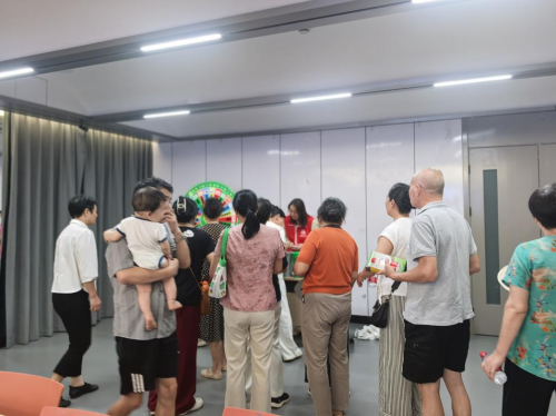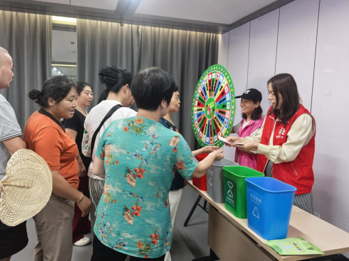 培训结束后,活动进入了轻松有趣的互动实践环节——“垃圾大转盘”和“垃圾回家”小游戏。“垃圾大转盘”以其新颖的形式吸引了众多居民踊跃参与。参与者转动标有各种垃圾名称的转盘,指针停留处即需准确回答该垃圾所属类别。游戏过程紧张有趣,既检验了刚学到的知识,又在欢声笑语中加深了记忆。为了增加居民的热情度,“垃圾回家”小游戏也十分具有挑战性,每位参赛选手先是仔细阅读了游戏规则,工作人员给参加游戏的居民发放画着各类垃圾的小卡片,让居民投入相应的桶内,根据投放的准确率,获得相应的小礼品。活动现场氛围十分活跃,大家都蠢蠢欲试。