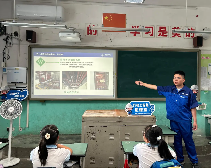 专业引领,开启机电知识之旅。成都地铁项目机电工程师李佳泳登上讲台,化身科普讲师。他针对小学生的认知特点,以生动有趣、通俗易懂的方式,详细讲解了地铁机电安装中的三大核心系统——通风与空调系统、给排水及消防系统、动力与照明系统。结合成都地铁建设中的实际案例,向同学们介绍了这些系统如何保障地铁安全、舒适运行。在讲解通风与空调系统时,工程师通过展示地铁车站内巨大的通风管道模型,解释了如何为地下空间输送新鲜空气、调节温度,让同学们直观感受到其重要性。同学们全神贯注,眼神中充满好奇,不时踊跃举手提问,“地铁里的空调会不会像家里一样滴水?”“消防系统是怎么知道哪里着火的?”现场互动氛围热烈,孩子们对地铁机电知识的渴望展露无遗。
