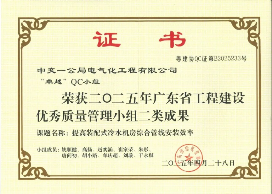 发布时间:2025-09-28 13:50:11 | 来源:中国网 | 作者: | 责任编辑:吴一凡近日,中交一公局电气化公司深圳地铁8号线二期工程QC小组课题《研发一种双曲铝板吊顶施工技术》《提高装配式冷水机房综合管线安装效率》分别荣获广东省工程建设优秀质量管理小组一类成果和二类成果。