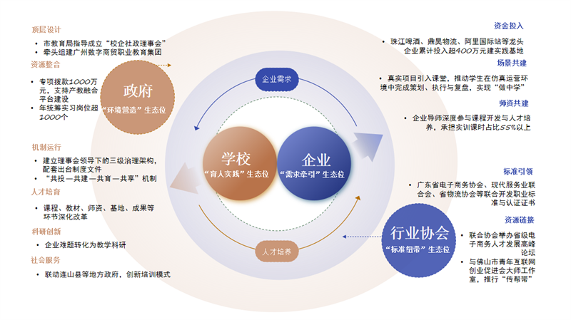 政府承担“环境营造”生态位,强化顶层设计与资源整合。在广州市教育局指导下,学院牵头成立“校企社政理事会”,组建广州数字商贸职业教育集团等,推动教育资源与产业需求精准对接。行业协会占据“标准纽带”生态位,发挥标准引领与资源链接作用。广东省电子商务协会等深度参与人才培养,通过举办省级电子商务人才发展高峰论坛,架起人才与产业对接桥梁。