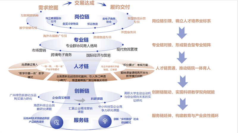围绕广州现代商贸流通产业“需求挖掘—交易达成—履约交付”环节,学院打造岗位链、专业链、人才链、创新链、服务链“五链贯通”的产教融合生态。